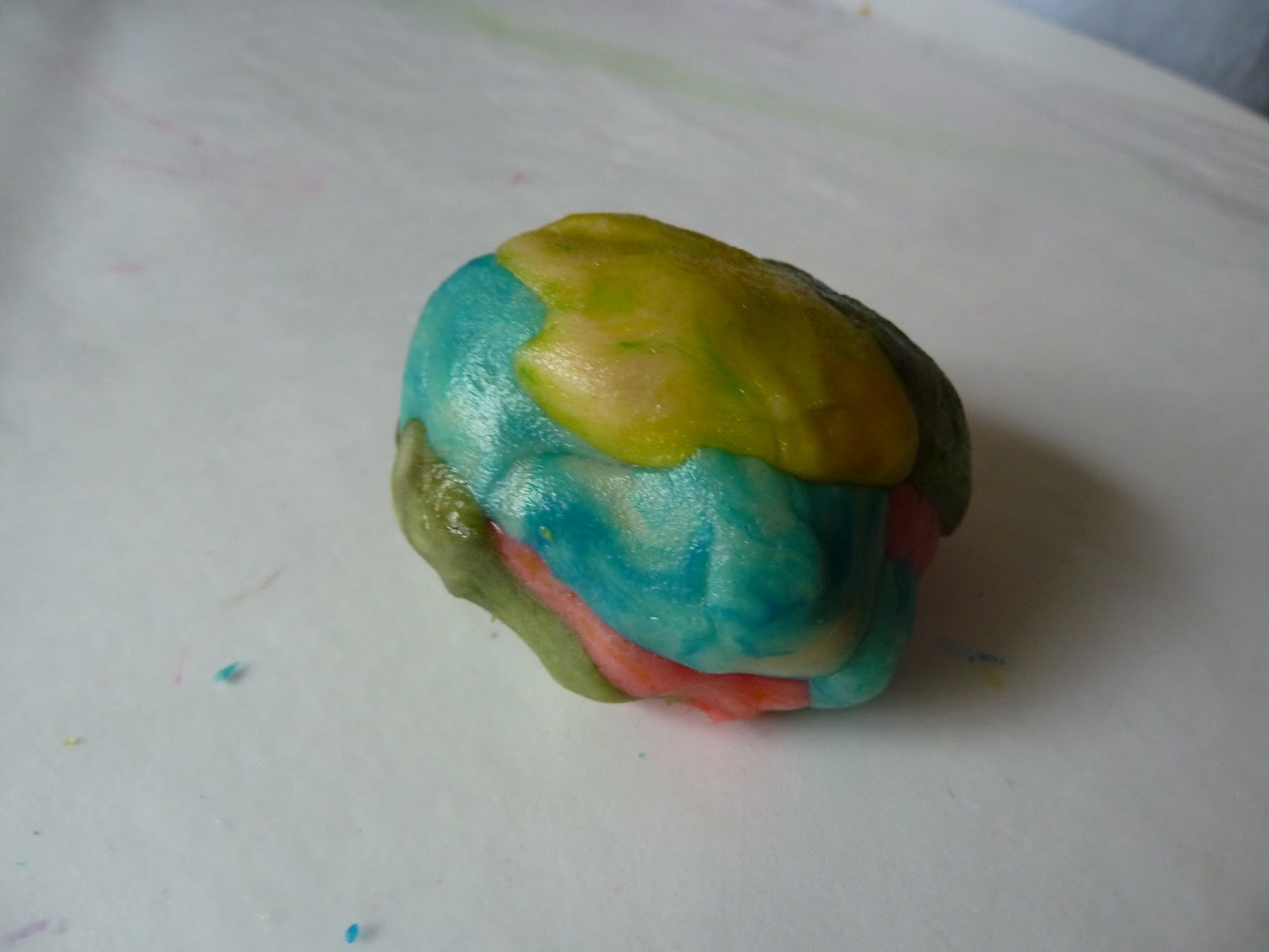 | Put a few drops of each color in separate pieces of dough and sort of mushed it together until the color mixed in fairly well |